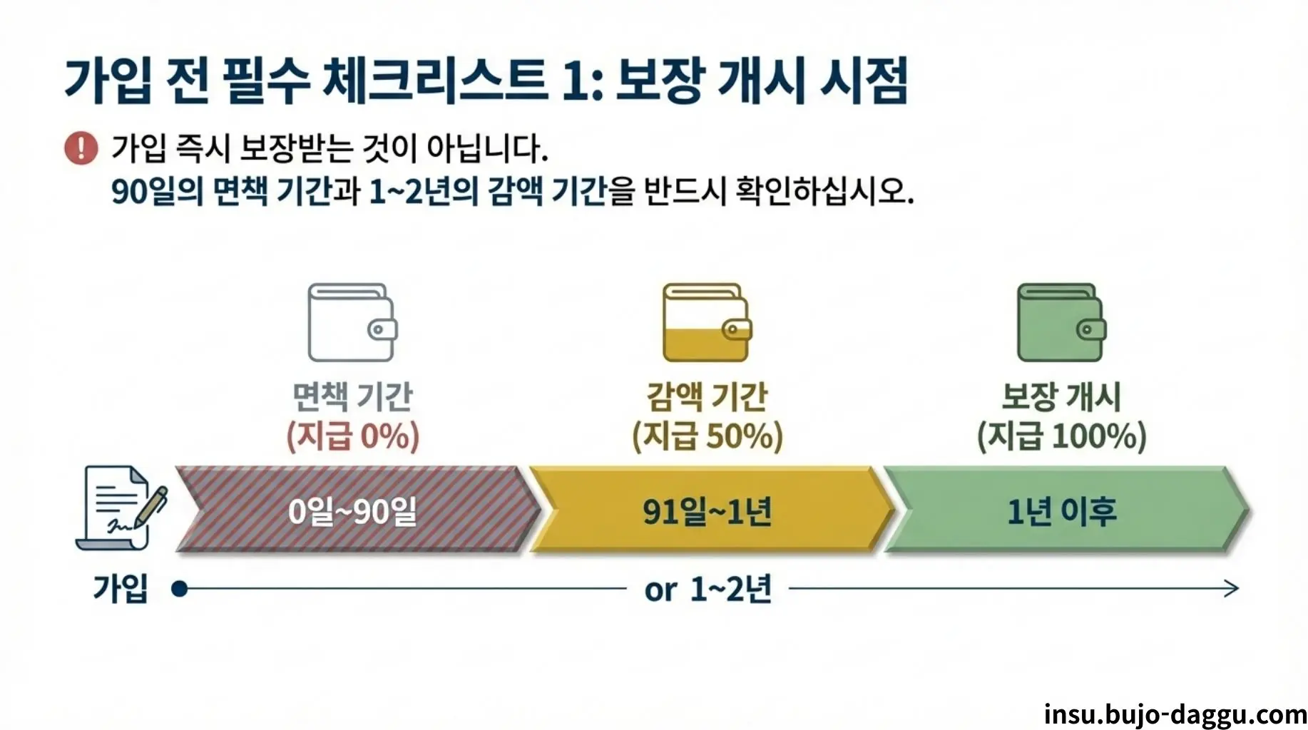 A6: 일반적으로 가입 후 90일 동안은 '면책 기간'으로 보험금이 지급되지 않습니다. 또한, 가입 후 1~2년 이내에는 가입 금액의 50%만 지급하는 '감액 기간'이 적용되는 경우가 많으니 주의가 필요합니다.