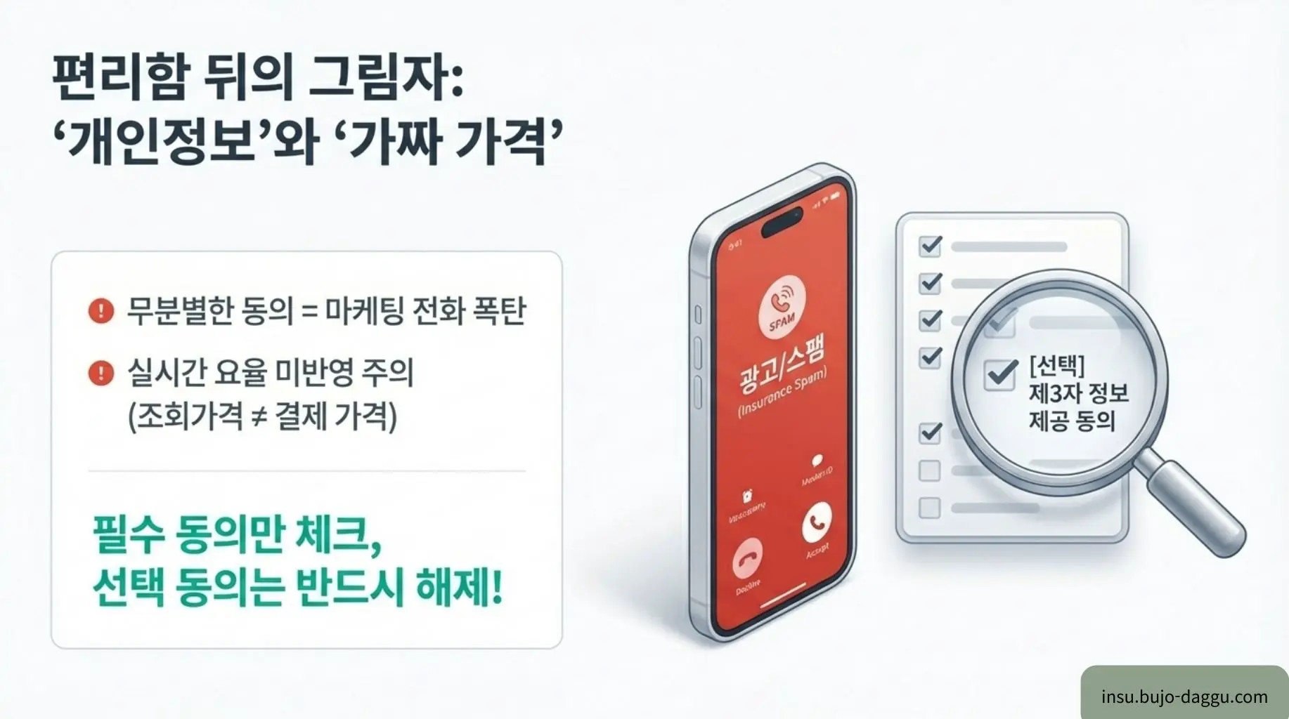 인슈의 조언: 비교견적 사이트를 이용할 때는 반드시 '선택적 마케팅 수신 동의' 항목을 해제하여 스팸 전화를 사전에 차단해야 합니다. 화면에 표시된 금액은 참고용으로만 활용하고, 실제 가입은 공식 홈페이지에서 검증하는 과정이 필수적입니다.